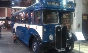 Bus in Transport Museum with the tram behind it.